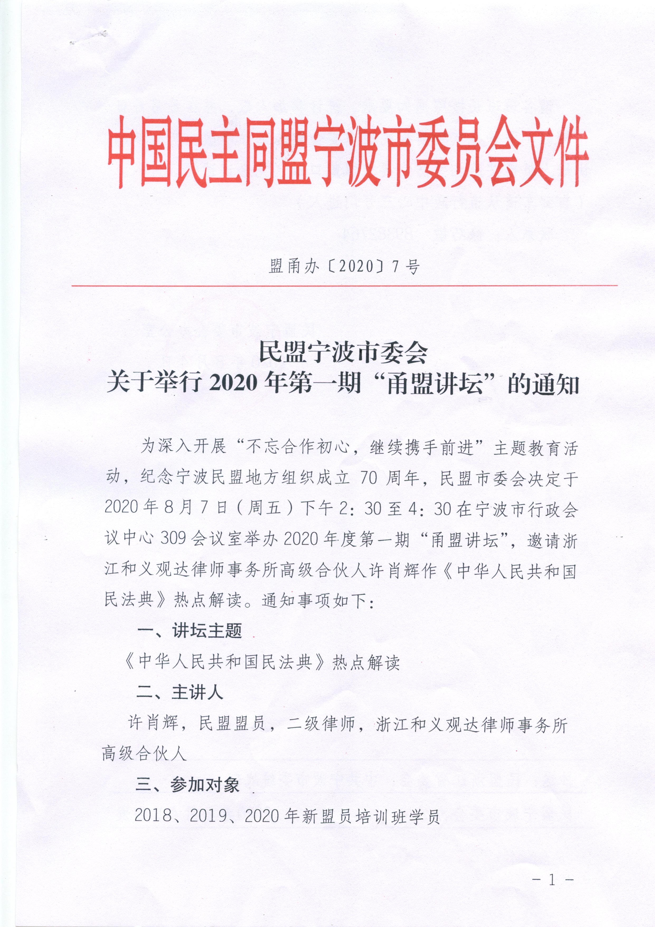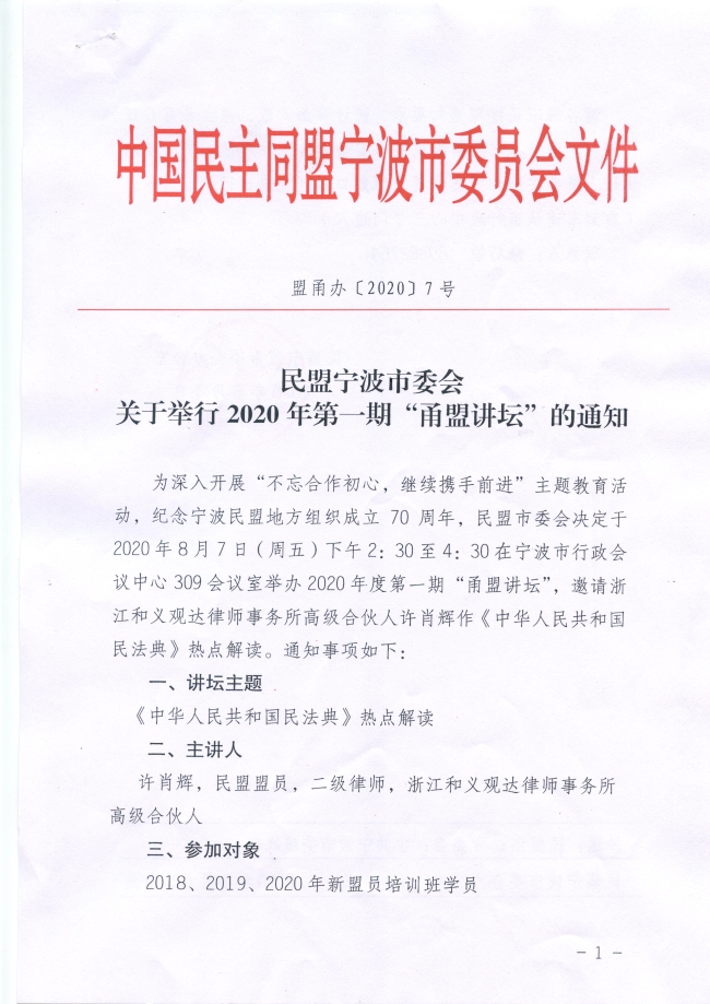民盟市委会关于举行2020年第一期“甬盟讲坛”的通知